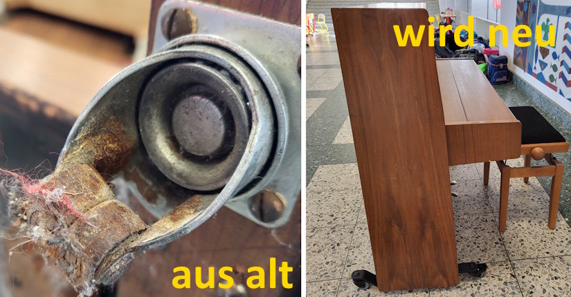Da wir durch den Neubau bedingt keine Bühne mehr haben, musste das Klavier runter in die Aula gestellt werden. Dort wird es künftig an unterschiedlichen Stellen gebraucht. Aber zerschlissene Klavierrollen sind ein häufiges Problem bei älteren Instrumenten, da die gusseisernen Rollen oder deren Achslager im Laufe der Jahrzehnte rosten, verschleißen oder brechen. Dies führt dazu, dass sich das Instrument nur noch schwer bewegen lässt oder die Rollen blockieren. Genauso war es bei unserem Klavier. Vom Pianohaus Keienburg wurden nun am Montag neue Klavierrollen montiert.