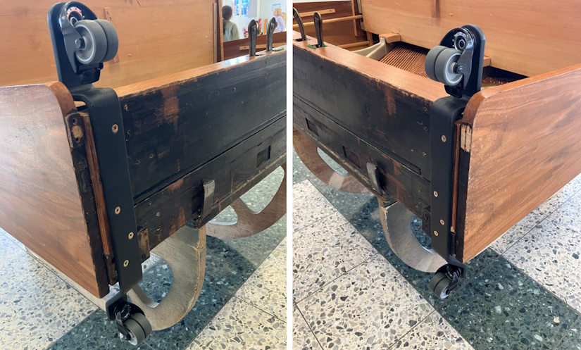 Hierzu wurde das Klavier zuerst ganz vorsichtig mit einem Umlegebock auf den Rücken gelegt. Danach schraubte Herr Keienburg die alten Rollen ab und montierte Rollenböcke mit Zwillingsrollen.