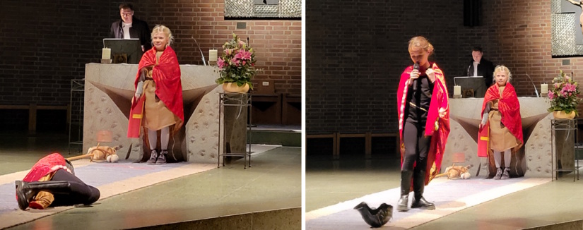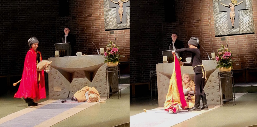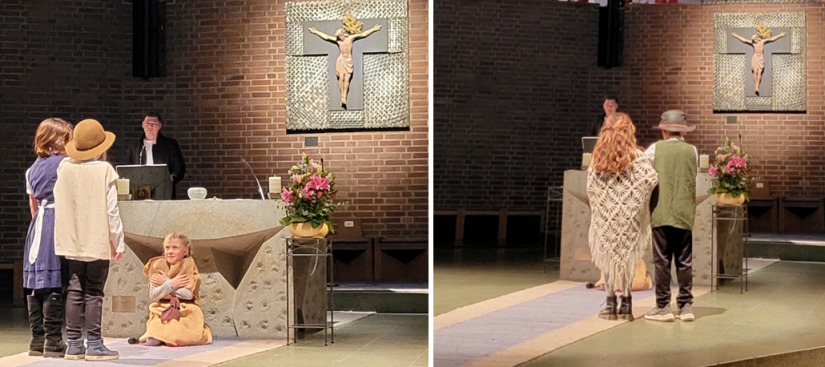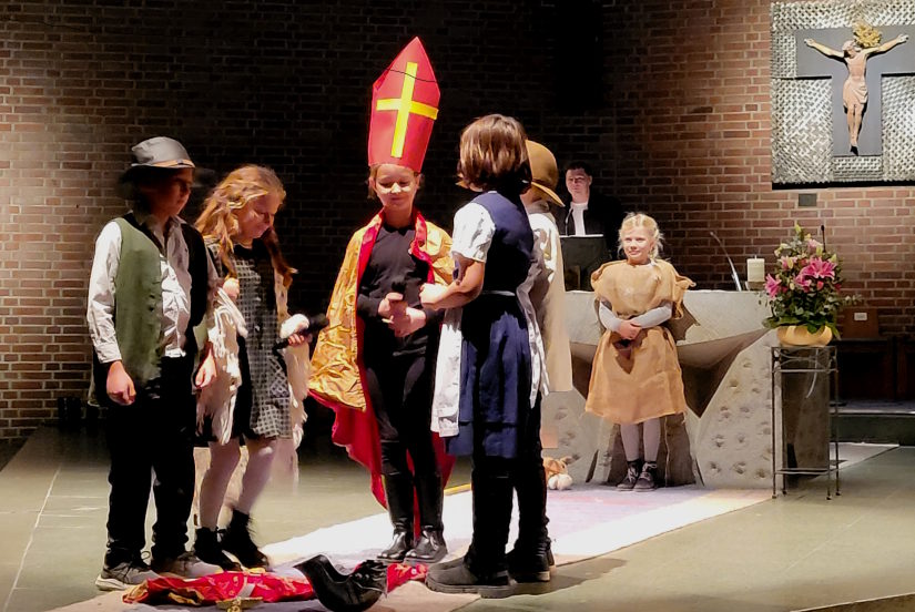 Beim Martinsfest der katholischen Gemeinde St. Barbara hat Herr Haiduk mit Kindern aus seiner Religionsgruppe die Geschichte des Heiligen Martin aufgeführt. Die Drittklässler haben es so gut gespielt und erzählt, dass es mucksmäuschenstill in der Kirche war.