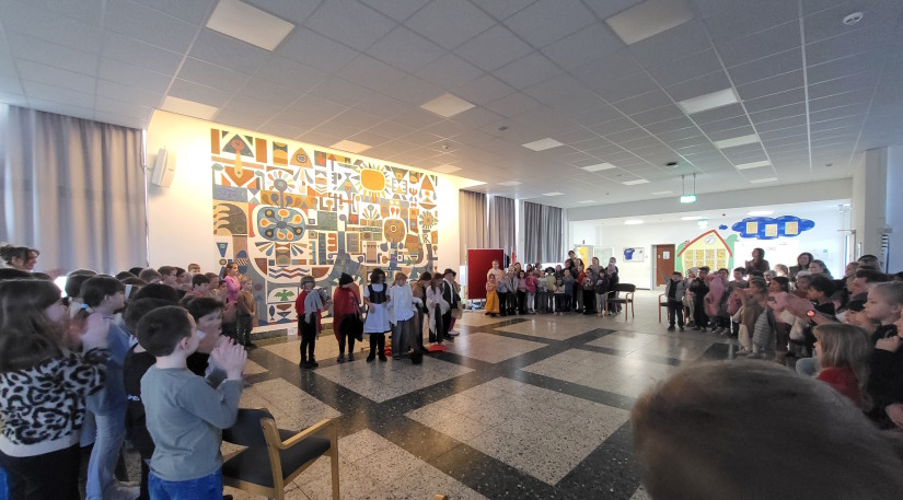 Eine Woche später führten die Kinder das Martinsspiel noch zweimal in der Aula der Barbaraschule auf, zuerst für die Klassen 1 und 4, danach für die Klassen 2 und 3.