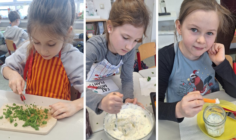 Auf dem Speiseplan stand selbstgemachtes Knabbergemüse mit leckerem Dip – natürlich alles von den Kindern eigenhändig vorbereitet. Mit großem Eifer wurde gewaschen, geschält und geschnippelt. Dabei lernten die Drachen wichtige Küchenregeln kennen, zum Beispiel den Tunnelgriff und den Krallengriff – damit die Finger sicher bleiben und die Karotten keine Chance haben!