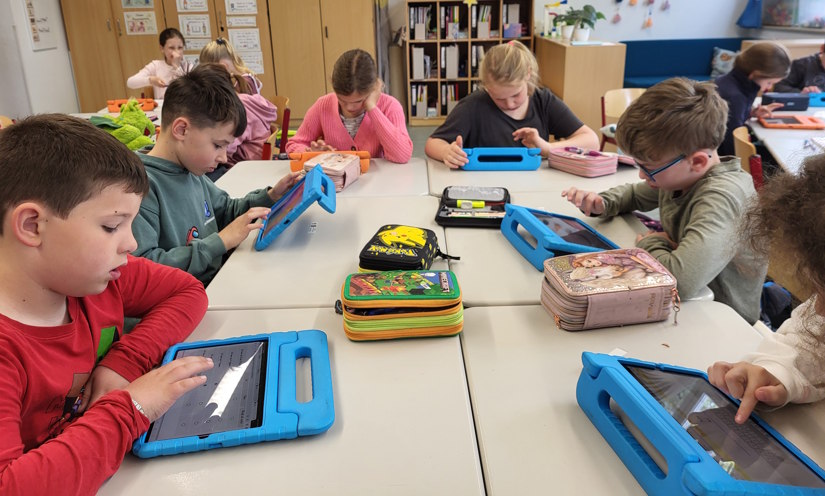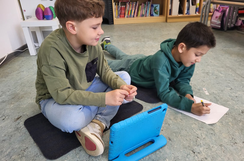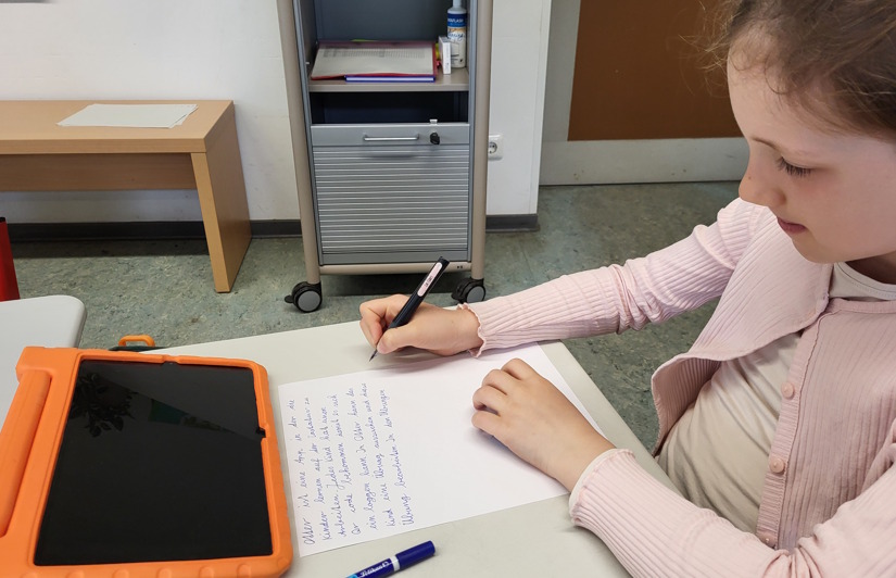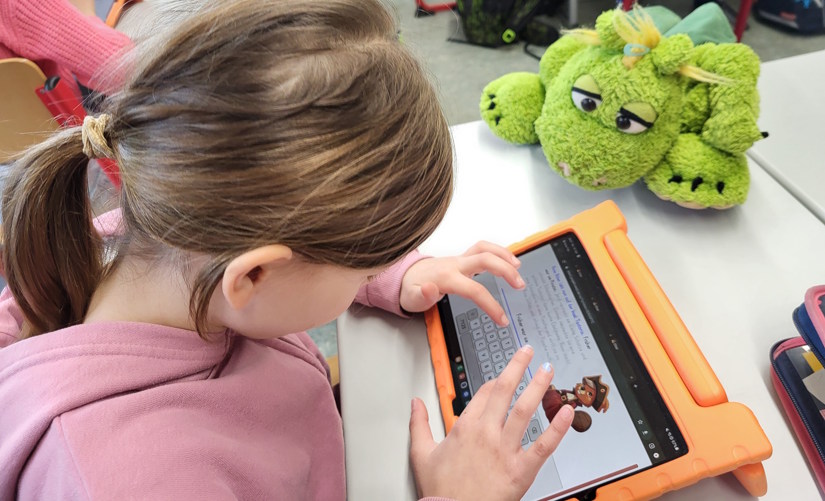 Auch Lia kann genau beschreiben, wie man mit diesem Programm arbeitet: „OTTER ist eine App, mit der wir Kinder lernen, auf der Tastatur zu arbeiten. Jedes Kind der Drachenklasse hat einen QR-Code bekommen, damit es sich in das Programm einloggen kann. In OTTER können wir uns eine Übung aussuchen und diese dann bearbeiten. Bei manchen Übungen wird die Zeit gestoppt, um z.B. zu zeigen, wie lange ein Kind gebraucht hat, um das Alphabet zu schreiben oder, wie viele Wörter in 2 Minuten geschrieben worden sind. Aber wir können uns auch mitten in der Übung ausloggen, denn OTTER speichert, woran man gerade ist. Und wenn wir uns wieder einloggen, können wir an dieser Übung weitermachen.“