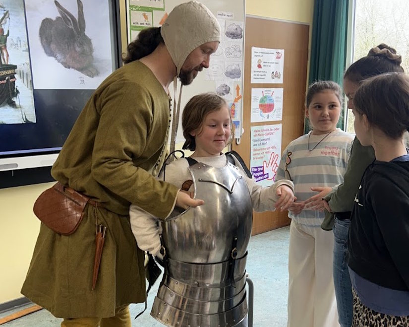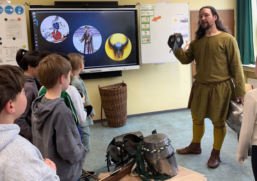 Ein spannender und lehrreicher Projekttag rund um das Thema Mittelalter fand in den Klassen 4a, 4b und 4c statt. Herr Krüger-Klaus besuchte alle drei Klassen und nahm die Kinder mit auf eine Reise in eine längst vergangene Zeit. Dabei klärte er auf sehr anschauliche und kindgerechte Weise über verschiedene Mythen und Vorstellungen vom Mittelalter auf und zeigte, was wirklich hinter so mancher Geschichte steckt.