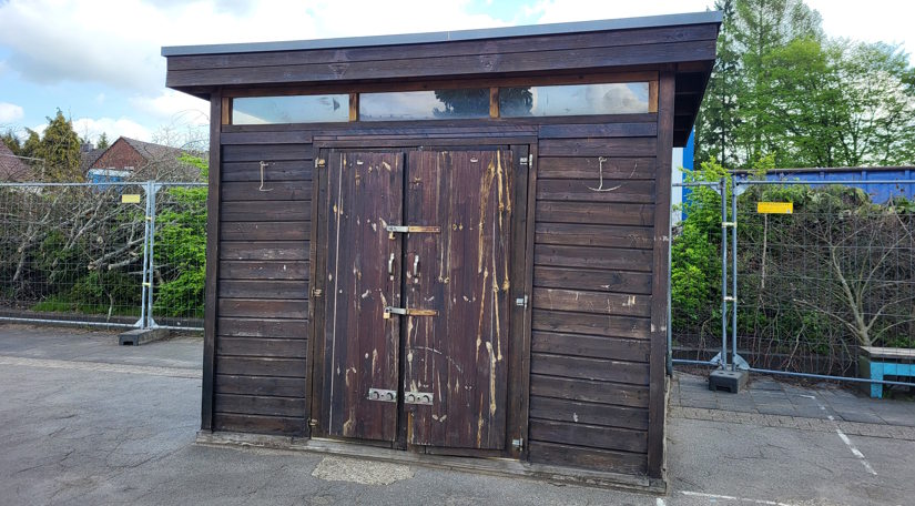 Trotz aller Pflege ist das Holz aber inzwischen völlig verwittert und auch die Türen haben sich komplett verzogen. Der Schulträger hat nun eine neue Spielzeughütte direkt rechts vom Schultor aufbauen lassen. Dieses Mal ist es eine witterungsbeständige Hütte aus Metall.