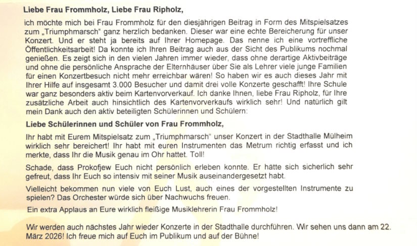 ich möchte mich für Ihren diesjährigen Aktivbeitrag zum Bolero von M. Ravel ganz herzlich bedanken. Es war im Vorfeld eine Menge Arbeit, diesen wirklich schwierigen Rhythmus einzustudieren. Ihre Schüler haben das prima hinbekommen. Hut ab! Ihre Schule ist ja seit vielen Jahren immer wieder aktiv dabei und Sie wissen, dass ohne Ihre tolle Unterstützung unsere Konzerte nicht erfolgreich laufen würden. Dafür möchte ich Ihnen ausdrücklich meinen Dank aussprechen. Es bestätigt sich jedes Jahr: Ohne die persönliche Ansprache der Elternhäuser über die Lehrer*innen und die Aktivaufführungen sind junge Familien für einen Konzertbesuch in diesem Umfang nicht mehr erreichbar. Und wir haben durch Ihre Hilfe tatsächlich ca. 2.800 Besucher*innen im Konzertsaal begrüßen können! Ich danke Ihnen für die immense Zeit der Einstudierung des Aktivbeitrags sowie die zusätzliche Arbeit auch hinsichtlich des Kartenvorverkaufs wirklich sehr! Und natürlich gilt mein Dank auch Ihren Schülerinnen und Schülern.