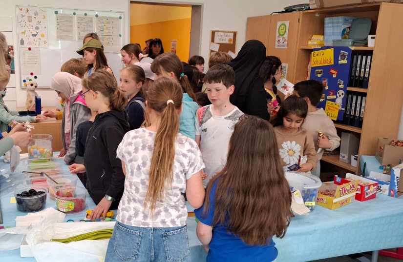 Riesenschlangen bildeten sich die ganze Zeit über vor Edi's Schulkiosk. Dort verkauften die Kinder der Erdmännchenklasse gemischte Tüten mit Süßigkeiten zum Aussuchen - wie an einer richtigen Bude!