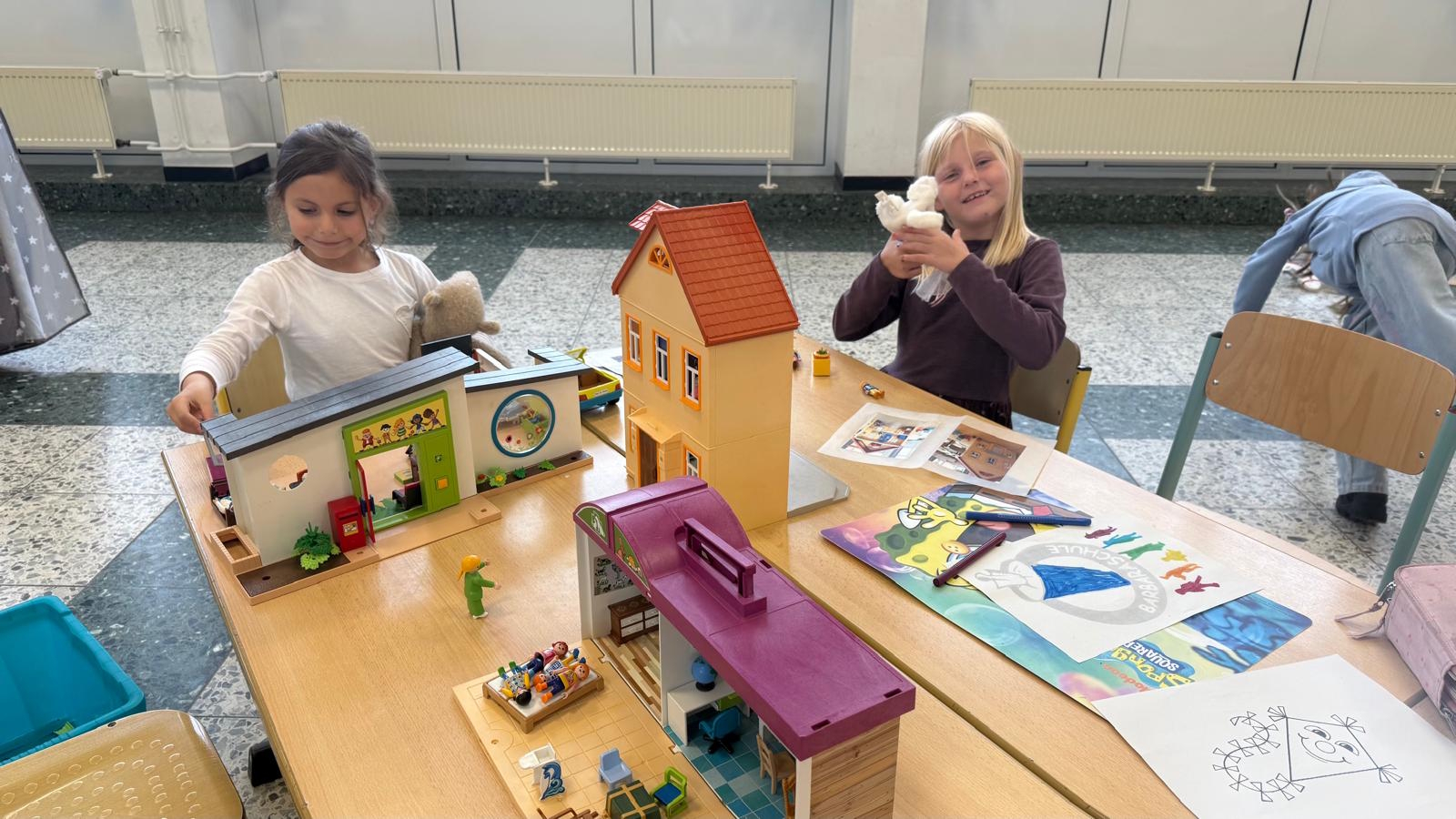 Die Kinder wählen ihr Spielmaterial aus und gestalten sich ihren Spielbereich. Konstruktionsmaterial, Barbie und Playmobil, das Puppenhaus, sowie Puzzle und Gesellschaftsspiele stehen zur Verfügung.
